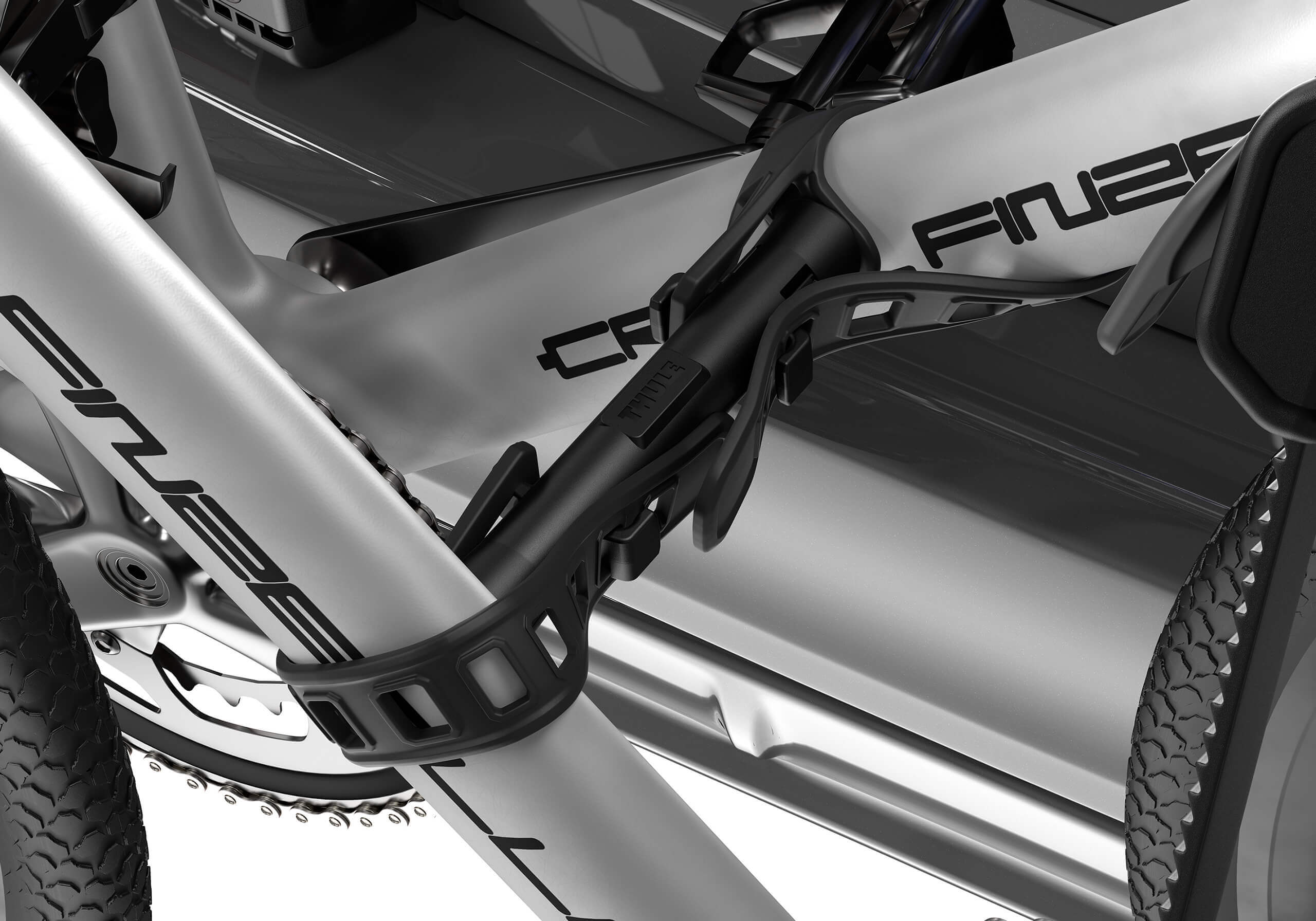 The OutWay Hanging attaches to the back of the car using dual-hooks with steel cables. All mounting points are rubber coated to prevent marks or scratches to the paintwork. These straps are secured using Thule's 'AcuTight' torque limiter knobs, these knobs click to let you know when you have fitted the rack tightly enough.