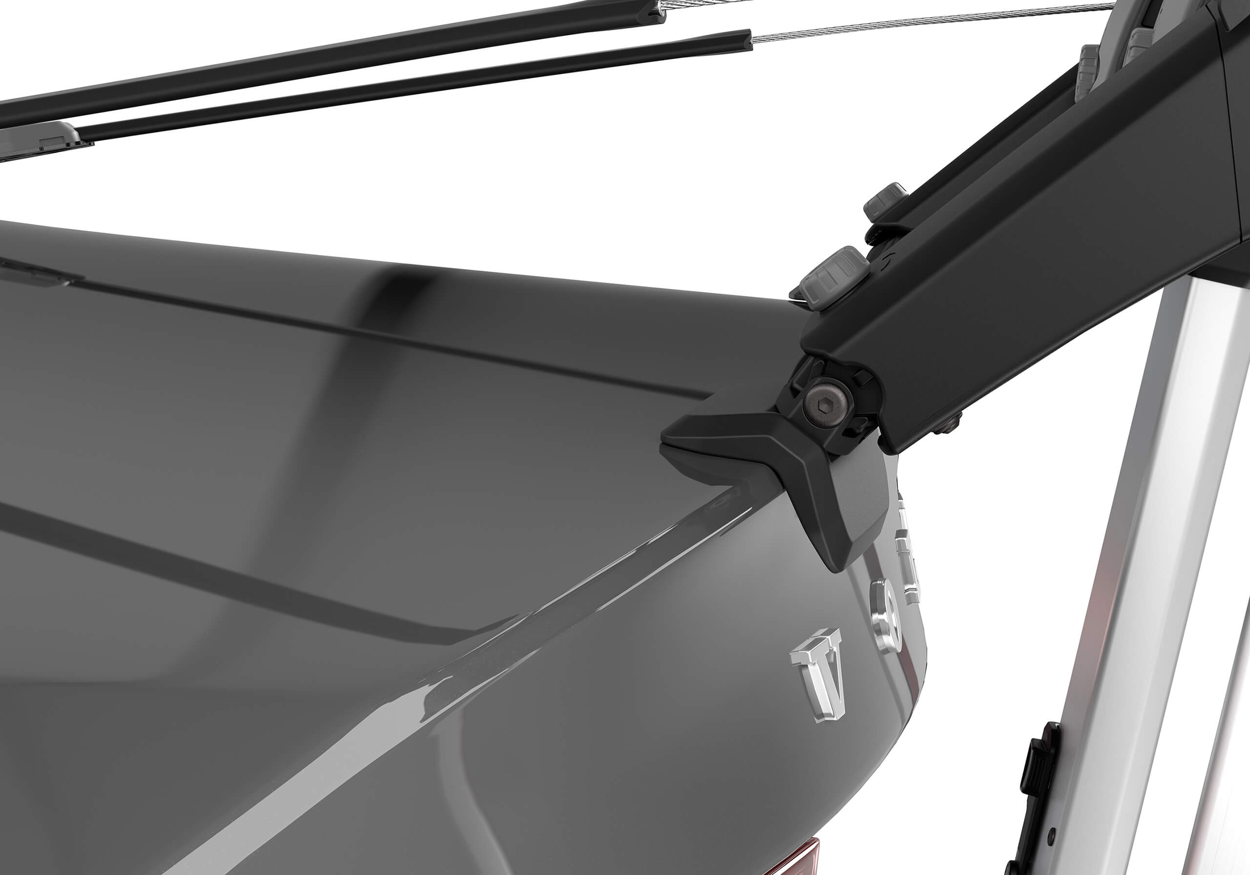 The OutWay Platform attaches to the back of the car using dual-hooks with steel cables. All mounting points are rubber coated to prevent marks or scratches to the paintwork. These straps are secured using Thule's 'AcuTight' torque limiter knobs, these knobs click when you have fitted the rack tightly enough.